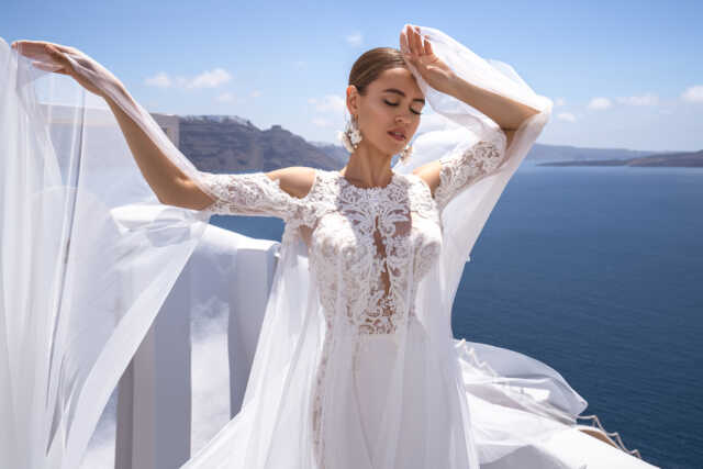 A beautiful embellished laced gown/ Lace embellishemnts covering a semi-sheer bodice leading down to an elegant crepe skirt with laced panels and an undertated train. Add some drama with the optional taylor cape.