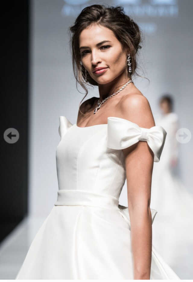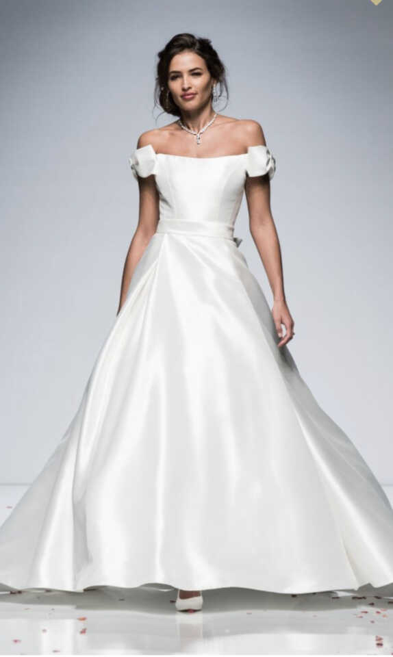 Stunning mikado dress with full skirt and bows on the shoulders. Fully boned and an inner corset to ensure a good fit. Small train makes the dress easy tomove and dance.