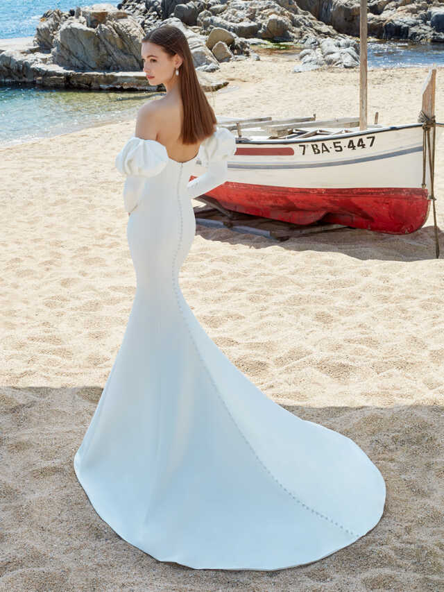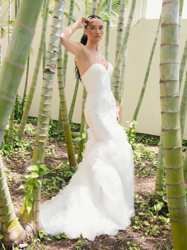 Clean, chic and romantic. The whimsical detail adds texture to this minimalist gown in matte Mikado, while body-contouring seaming keeps the gown fitted throughout the hips into a flare skirt coated in hand-cut, multi-layered organza and tulle ruffles. A sleek bodice and a striking skirt combine to make a statement. Also available with the dress are the sleeves from style Alyson to make an extra WOW statement or for 2 separate looks day to evening. Very INSTAWORTHY gown.