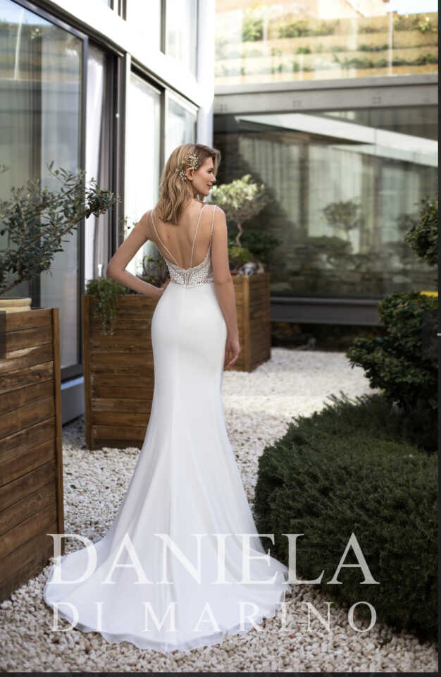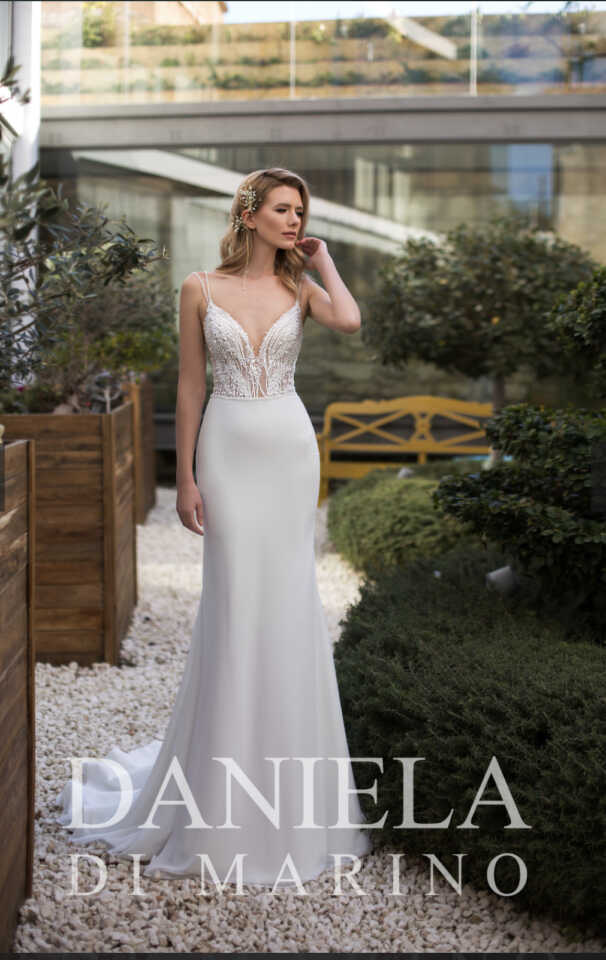 Beautiful Daniela Di Marino 'Gilberta' Dress in all Ivory. Detailed lace bodice with beaded detail at the waist. Two beaded straps that join separately at the back creating a lovely open back. Very tihgt fitting mermaid style. Chiffon overlay which looks like crepe but softer silhouette.