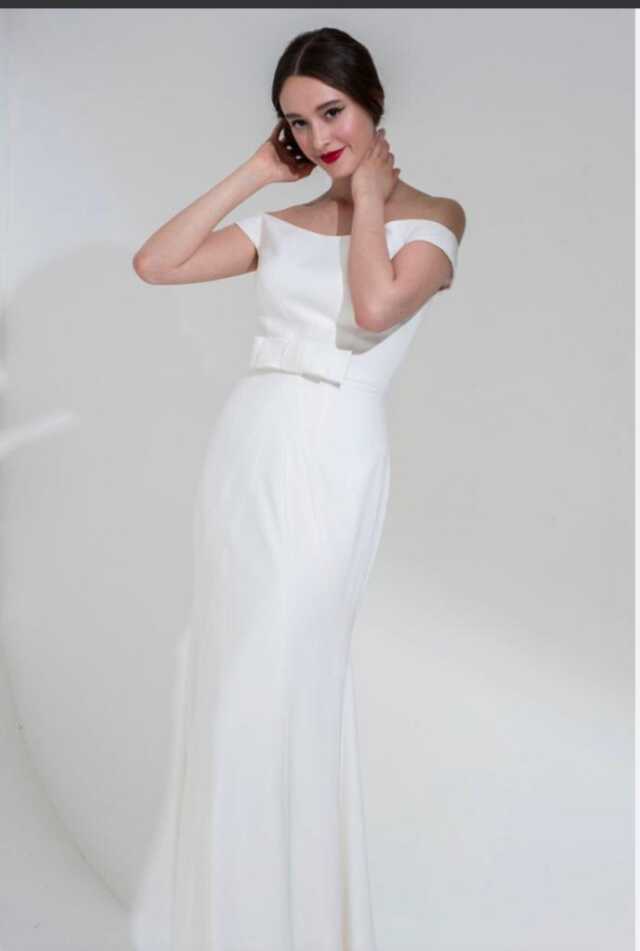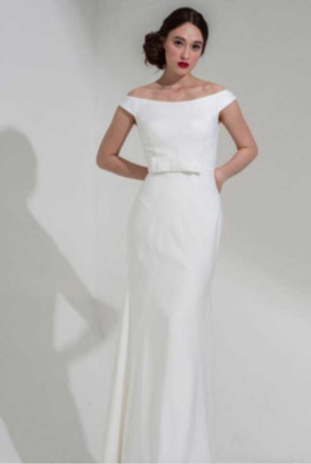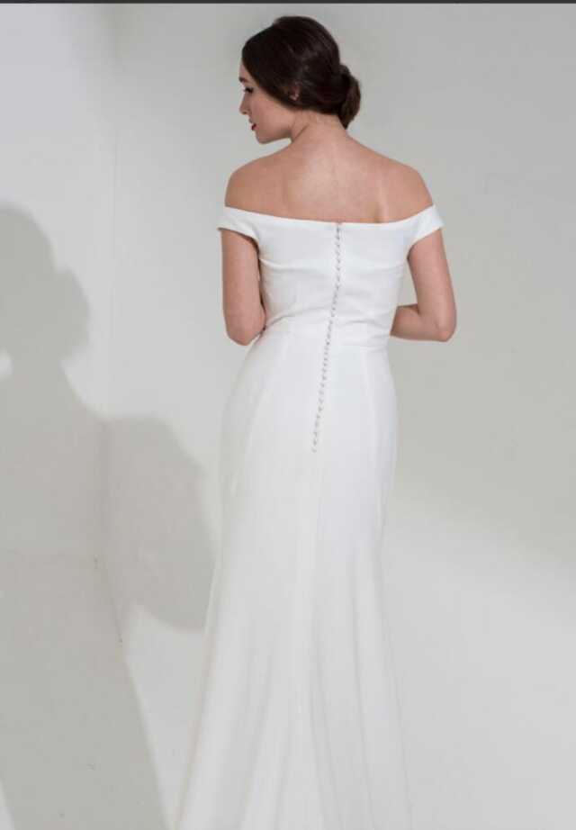 FREDA BENNETT DREW is a classic mermaid wedding dress in crepe with beautiful tailoring for a flattering fit. It features an elegant off the shoulder neckline. The back of the gown is fastened with delicate fabric covered buttons. Our sample is minus the bow!!
