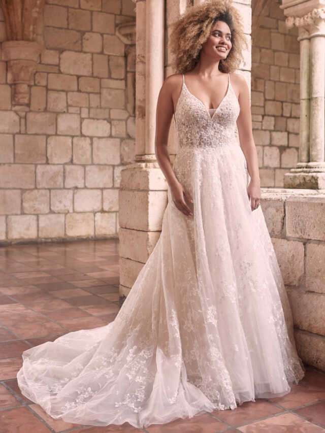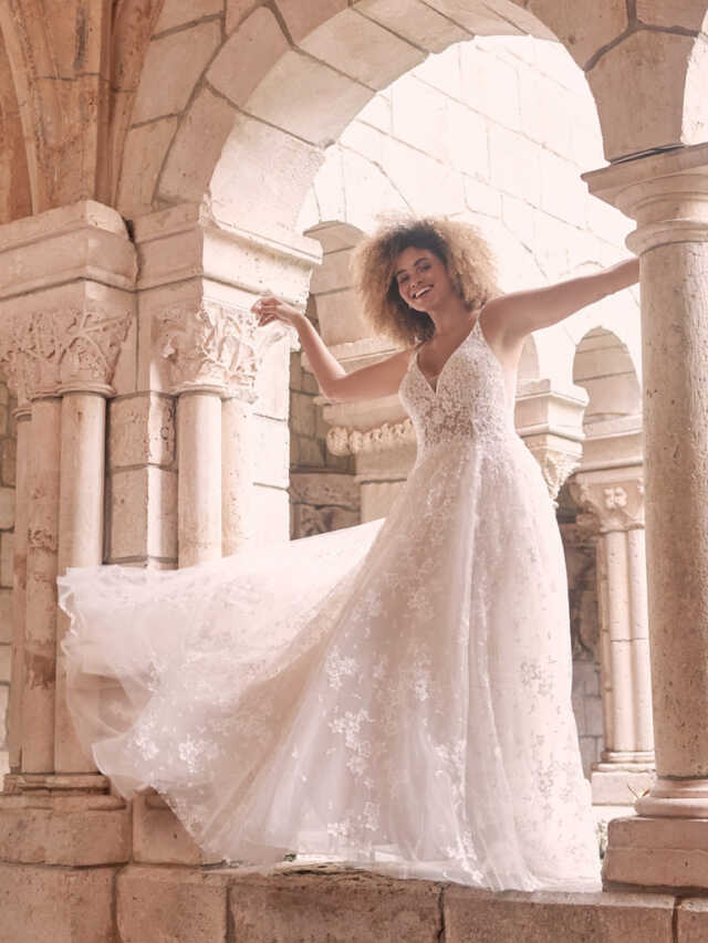 Lorenza by Maggie Sottero is a floral boho A-line wedding dress in soft and dreamy layers with a flattering classic A-Line shape, spaghetti straps into a v-shaped front neckline and a super wow v-shaped plunge back. The Go Bridal team loves the gorgeous lace and the simple design.