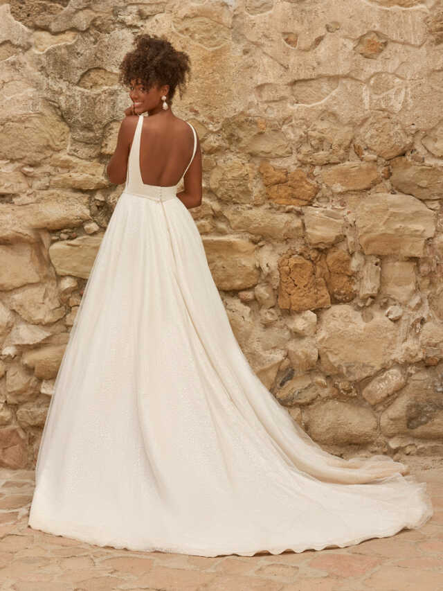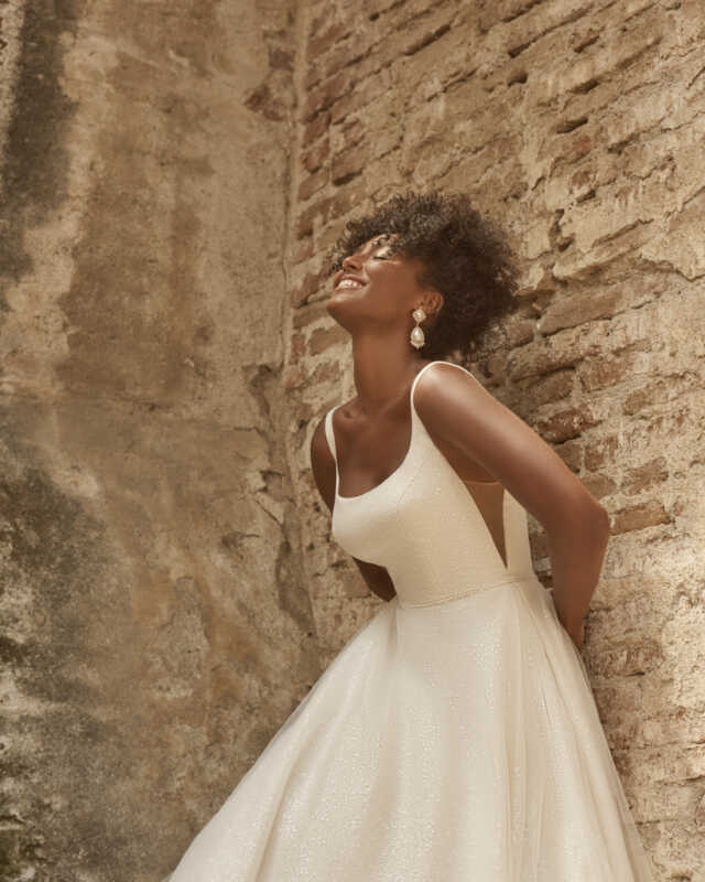 Modern ballgown with a deep square back. A glitter organza fabric. True to its name, this modern ball gown wedding dress harmonizes form and function like a sweet and breezy sonata.