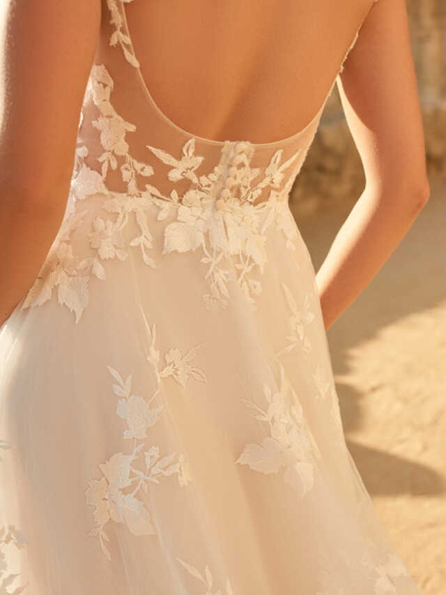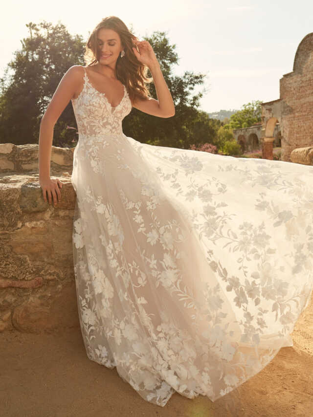 Winter by Maggie Sottero is a whimsical lace A-line wedding gown for fairytale vibes. We love the modern look with plunging illusion v-neck, delicate spaghetti straps, and the illusion effect with lace detail and we are positive you will too. Winter is fast becoming one of our styling team’s favourites with its gorgeous detail, illusion materials, and add-on sleeves.