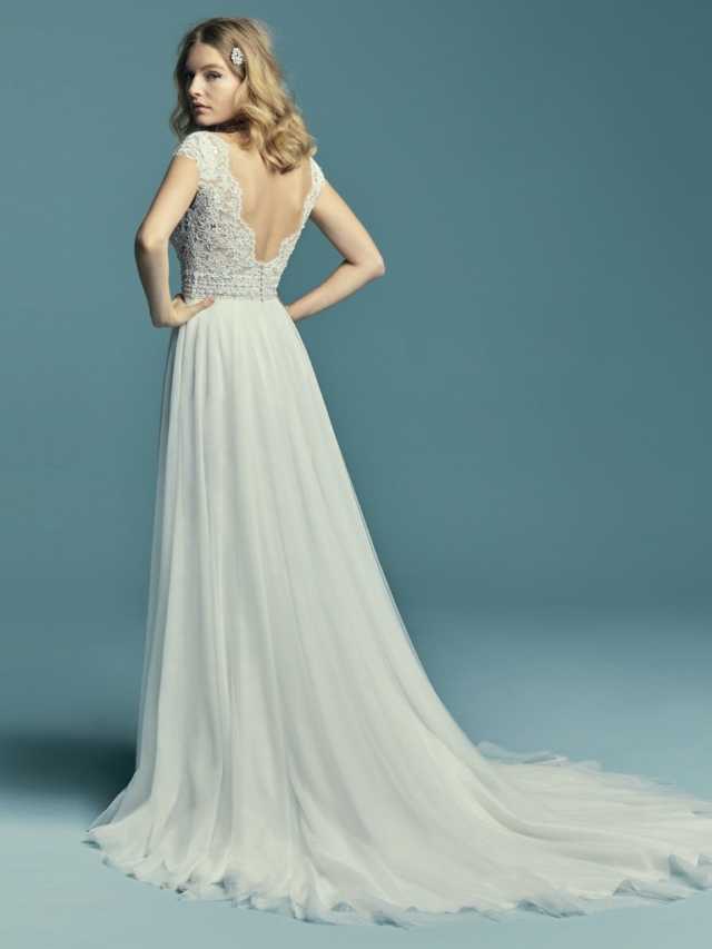 Delicate lace motifs accent the bodice in this boho wedding dress, creating sheer cap-sleeves, an illusion V-neckline, and a sheer V-back. Swarovski crystals adorn the bodice and belt motif. A-line skirt comprised of tulle.