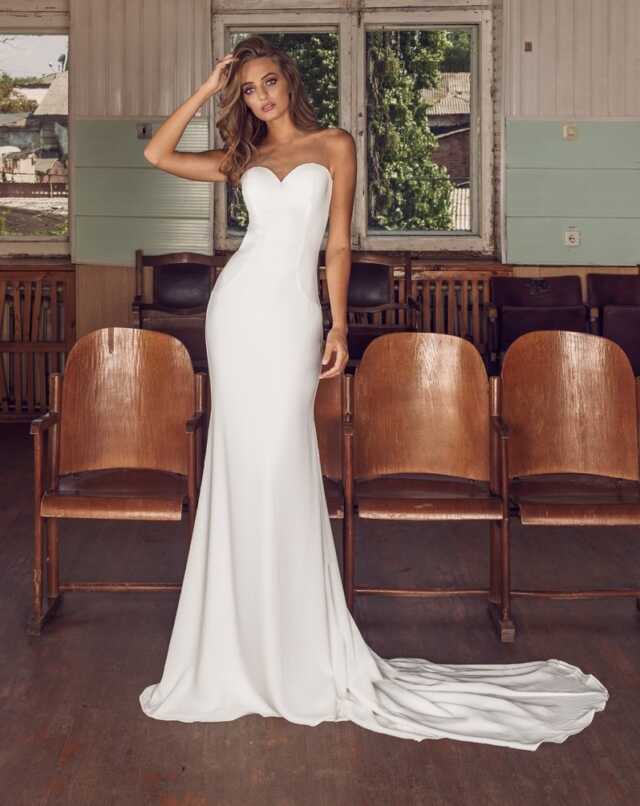 Stunningly simple crepe dress with a fluid trumpet skirt.