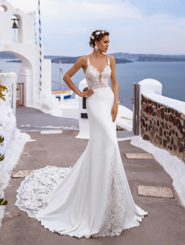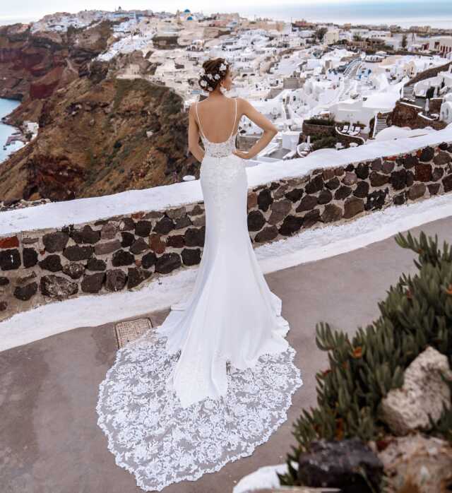 Amazing wedding dress with straps with a train. The translucent bodice, made of Chantilly guipure lace adds drama and romance to the look.