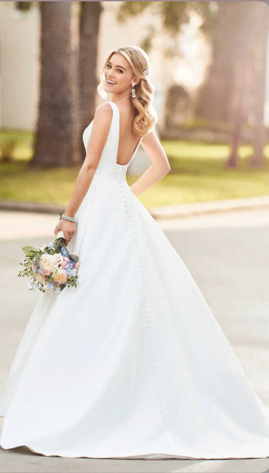 6758 by Stella York is simply beautiful. From bridal designer Stella York, this gorgeous gown is for the bride who wants to have a timeless style on her wedding day. Made of matte Mikado fabric, the ballgown silhouette features a modern empire waist and open, square back. A small pleat in the skirt allows the ballgown skirt to keep its shape beautifully. Fabric covered buttons run down the length of the train and pockets have been added for one final modern touch.