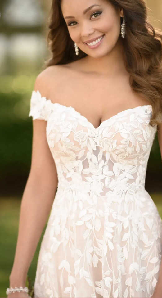 Our romantic A-line wedding dress 7012 by Stella York with organic leaf pattern and a feminine A-line silhouette, featuring off-shoulder sleeves and a subtle sweetheart neckline for a highlighted décolletage. The dress has a matte look that fashion-forward brides will love and also features a slightly sheer bodice underneath the gently cascading leaves—falling at varying lengths below the waist and onto the full A-line skirt of layered tulle.