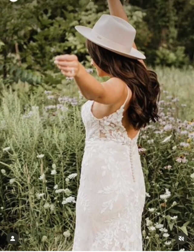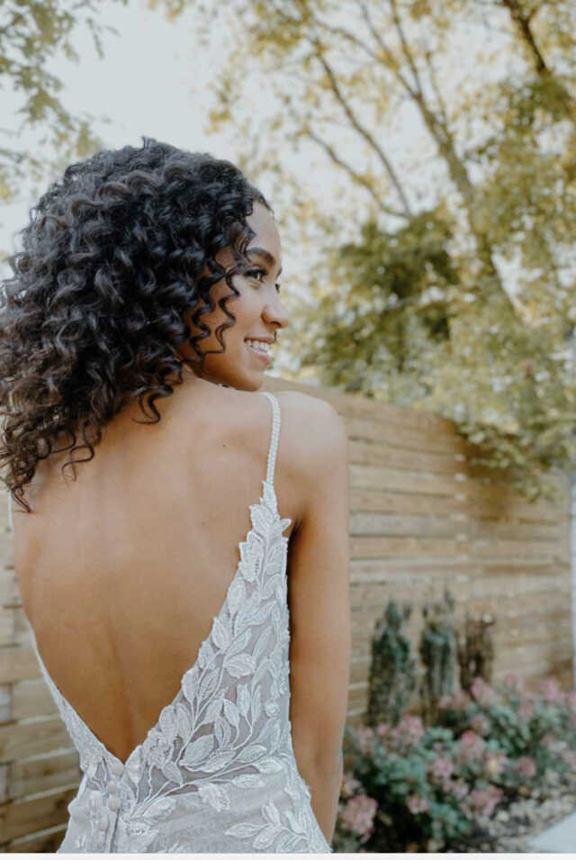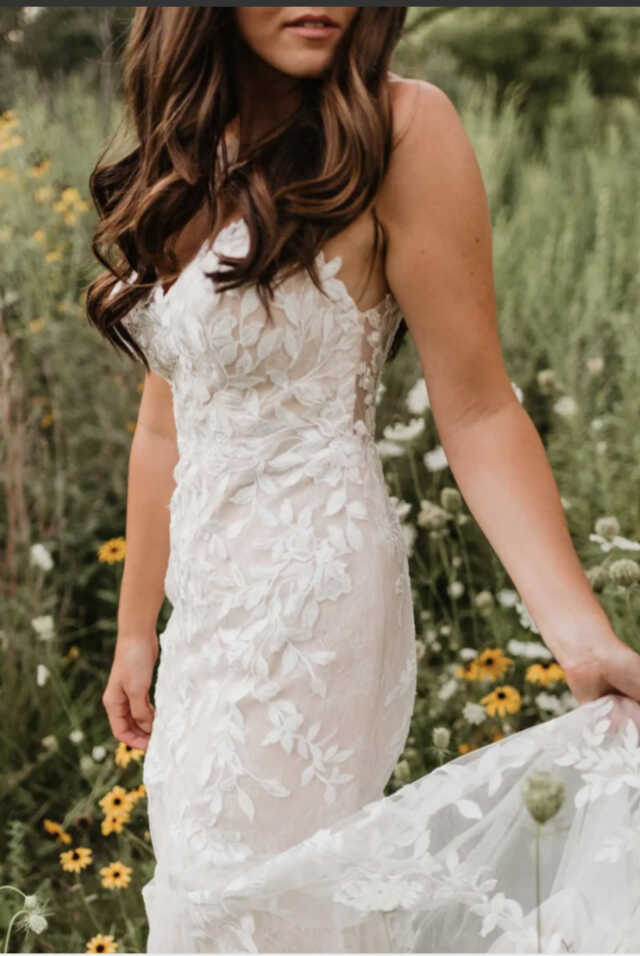 7312 by Stella York is an organic lace-inspired Fit and Flare wedding dress where glamour meets Boho beauty. The gorgeous dress features a neutral-colored lining and sheer bodice to really make the leafy lace pop out! We love the special lace and the figure-hugging silhouette.