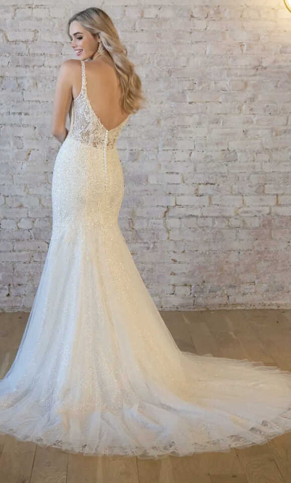 7479 by Stella York radiates red carpet-worthy glamour from head to toe. Shimmer sequins, brilliant beading and luxurious lace strike a stunning balance in this fit-and-flare silhouette. The plunging neckline and delicate spaghetti straps highlight the décolletage, while the low back detail and fabric buttons flatter the figure. The final finishing touch is the flowy and frothy tulle skirt that sparkles, catching the light with every movement.