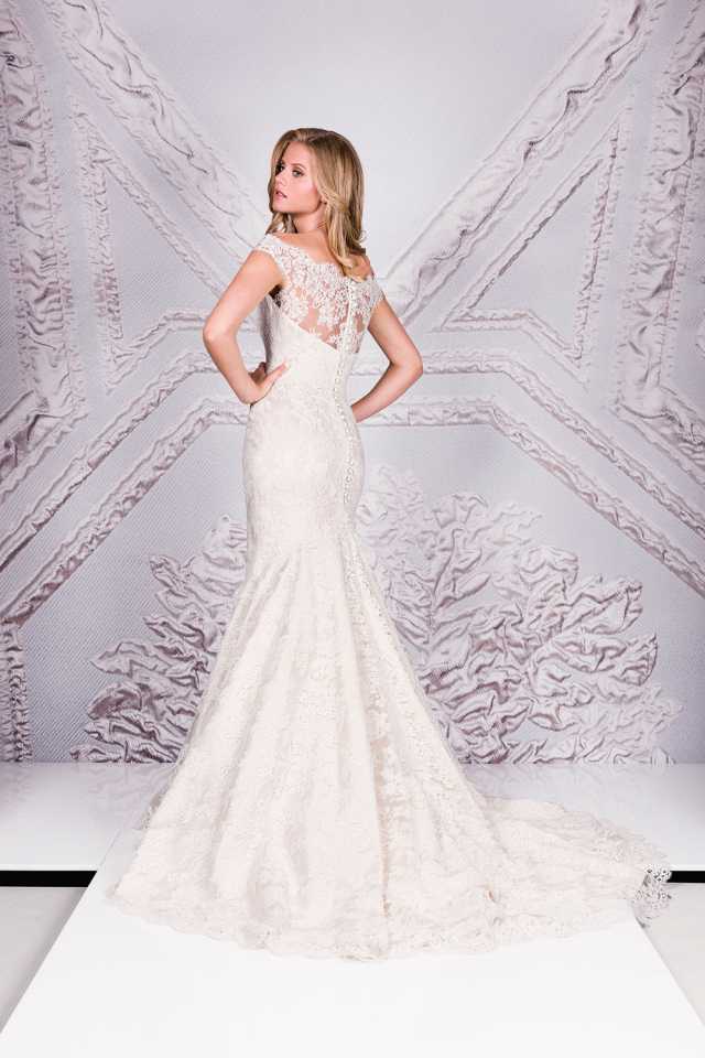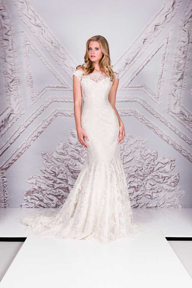 Degas is the ultimate vintage lace fish tail with off the shoulder, illusion neckline.