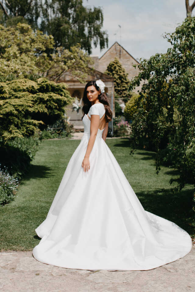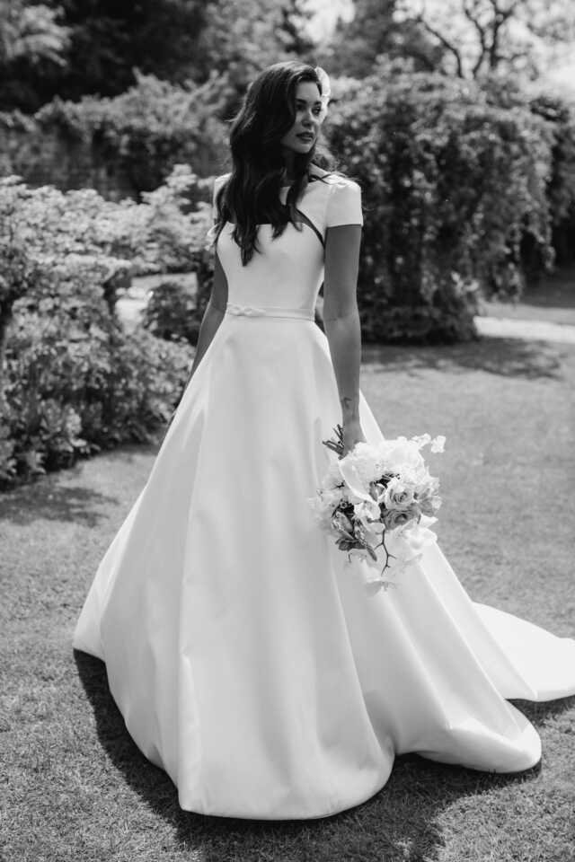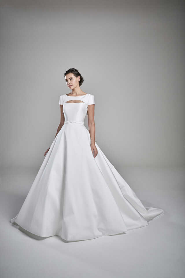 From the 2022 Nova collection. A line gown featuring a modern sweetheart contoured neckline. Framed with an iconic modern jacket to transform your bridal look. The statement skirt is in a sumptuous mikado fabric.