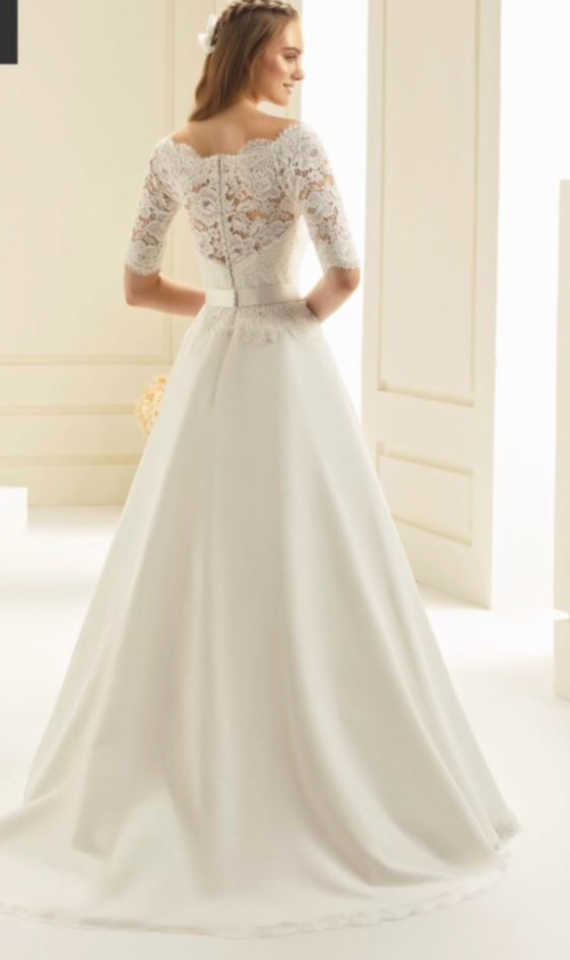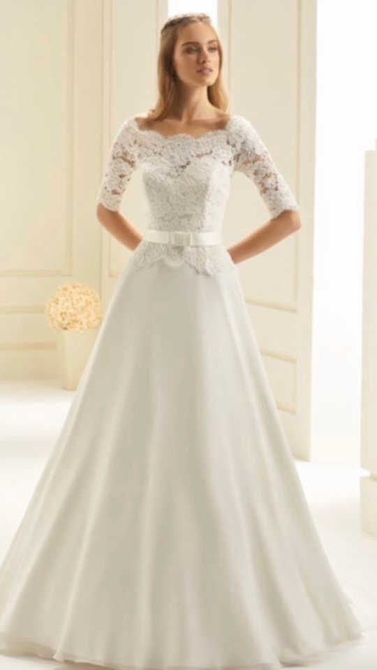 Lace off the shoulder bodice with 3/4 sleeve. Chiffon A line skirt with a detachable bow belt