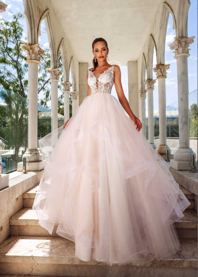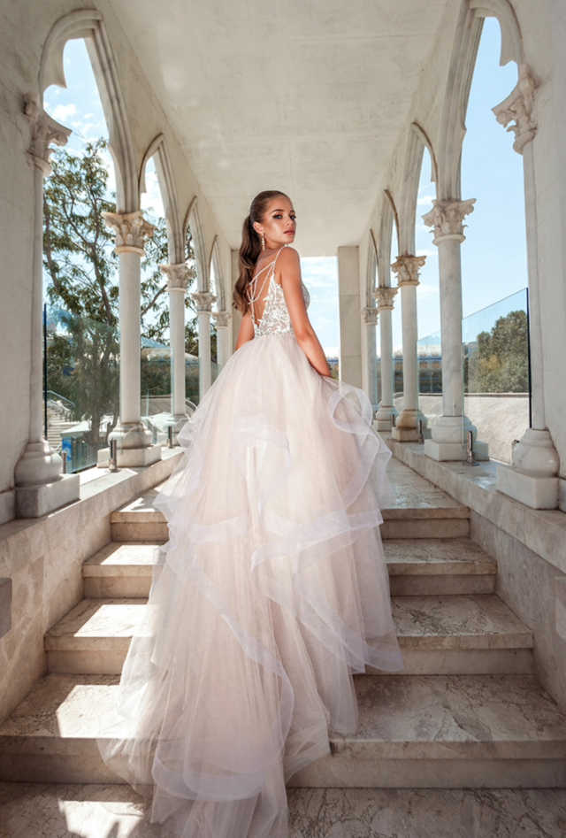 Layered tulle skirt with lace bodice and beautiful pearl back drape