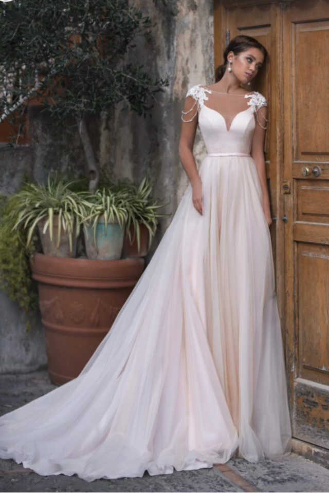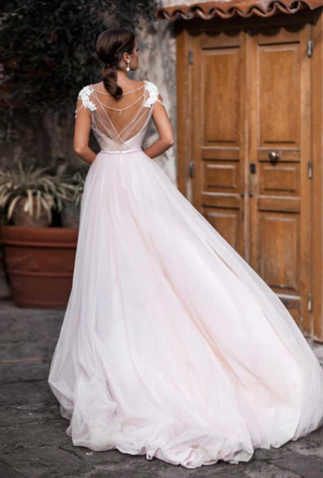 This blush pink gown is stunning with its beading draping on back and shoulders