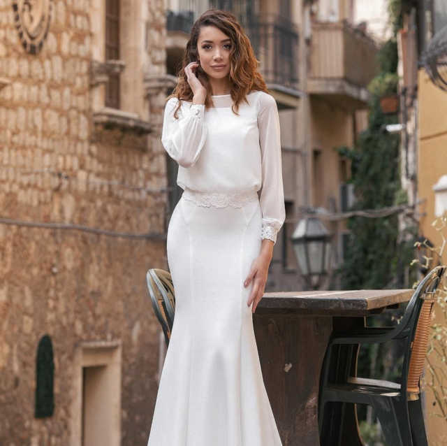 Crepe gown with detachable chiffon blouse jacket with lace detail